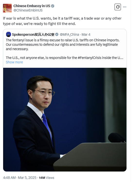 We have a post on Wednesday by the Chinese Embassy in the US, echoed in the official briefing on the just-ended National People’s Congress, that said China was ready for “a tariff war, a trade war or any other type of war”, and would “fight till the end”. An astonishingly blunt statement by any account.