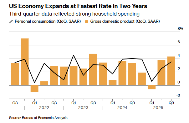 Last week delivered a strong US Q3 GDP report – quarter-on-quarter growth came in at 4.3%, well above the consensus estimate of 3.3% and Q2’s 3.9%.