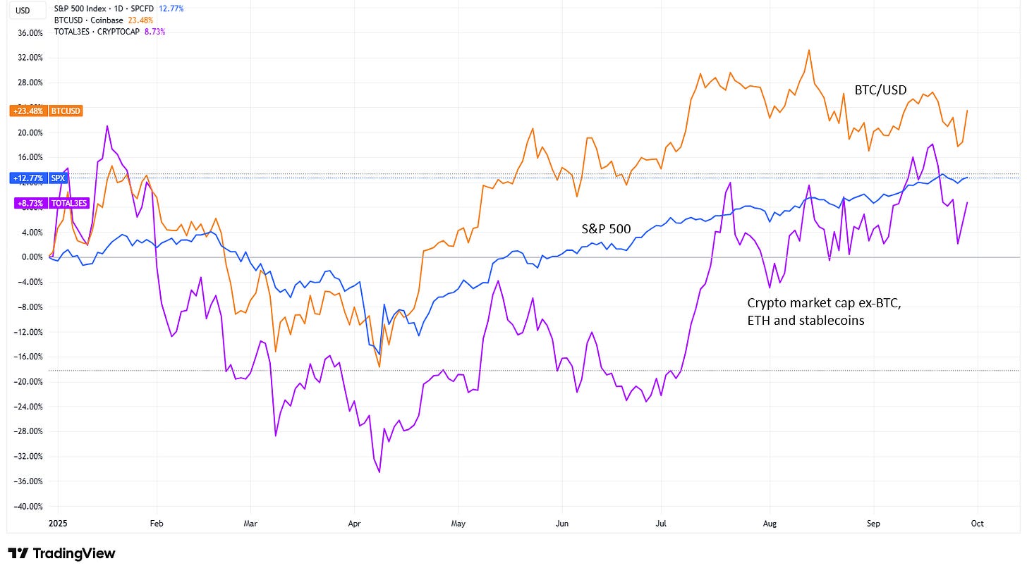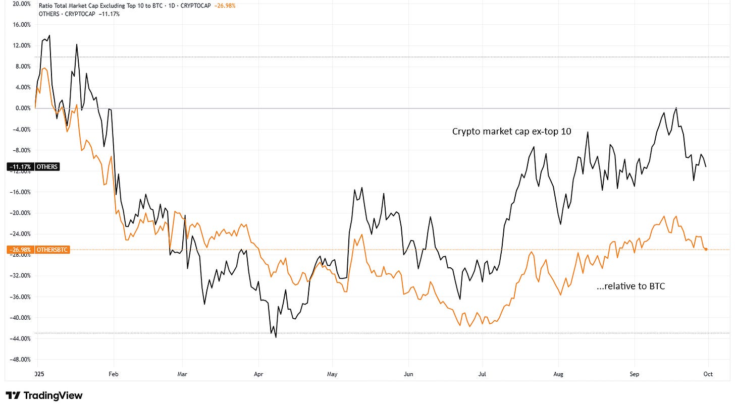 Remove the market caps of BTC, ETH and stablecoins, and the crypto market has grown a measly 7%.